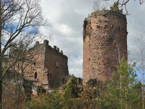 Château en Ruine. Voir arceau en cintre surbaissé de 5 à 6 m de diamètre. Le château fut construit au XIIIème siècle avec des pierres du mur païen. Il appartint successivement aux Seigneurs de Rathsamhausen puis au chevalier Gauthier ERB qui s’adonna au brigandage. En 1406, la ville de Strasbourg assiégea le château. ERB parvint à s’échapper, mais son château fut détruit de fond en comble. L’accès aux ruines est interdit.
